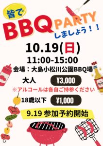 会員の皆様にお知らせです。 10月19日(日)はBBQ会を 開催する為、 臨時休…